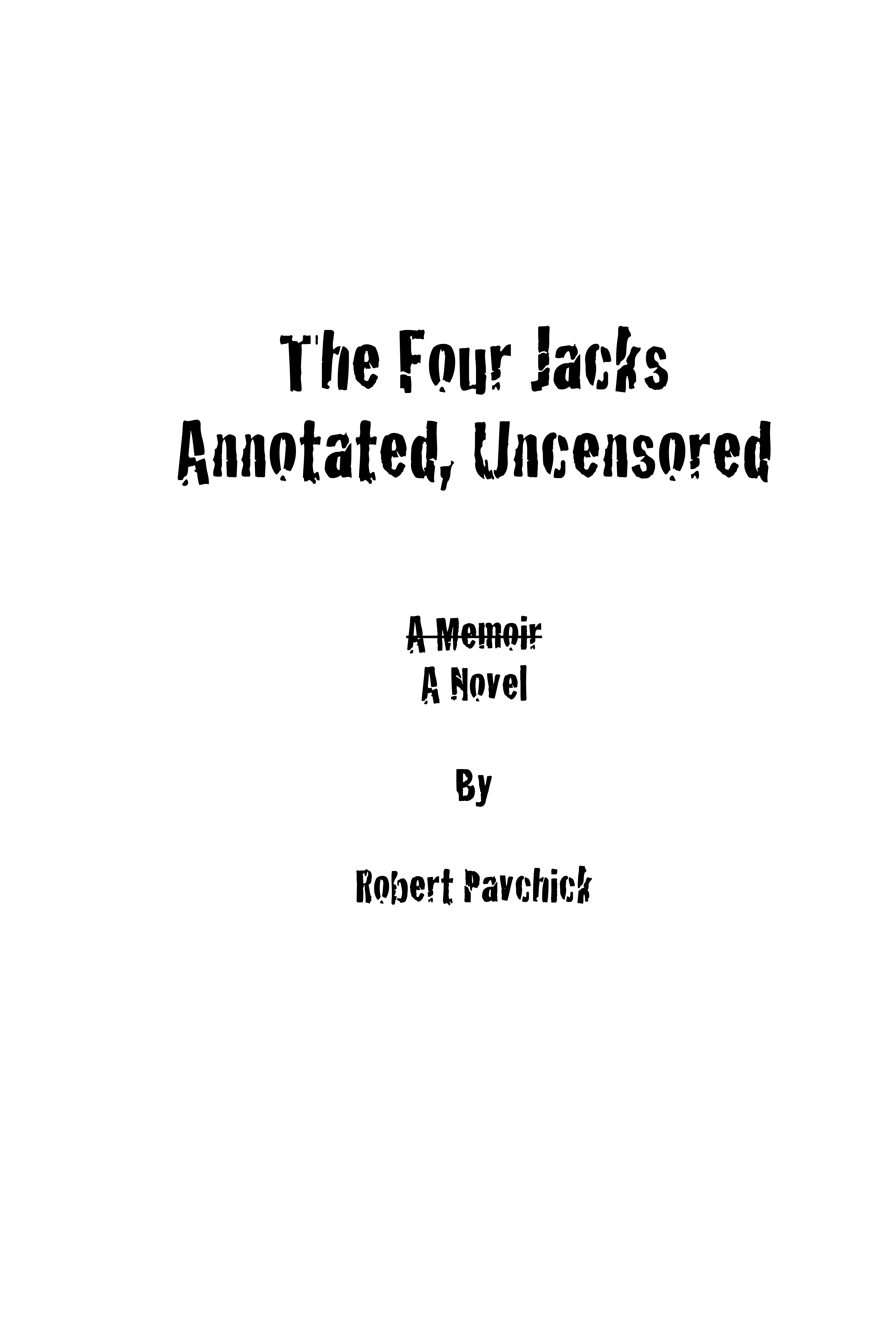 Beginning on April Fool’s Day 2026, The Four Jacks Annotated, Uncensored will be available on Amazon in paperback, hardcover and Kindle editions. I recommend the print options. The novel includes 145 demented footnotes essential to the story, which are a smidge awkward to read in a Kindle format.
