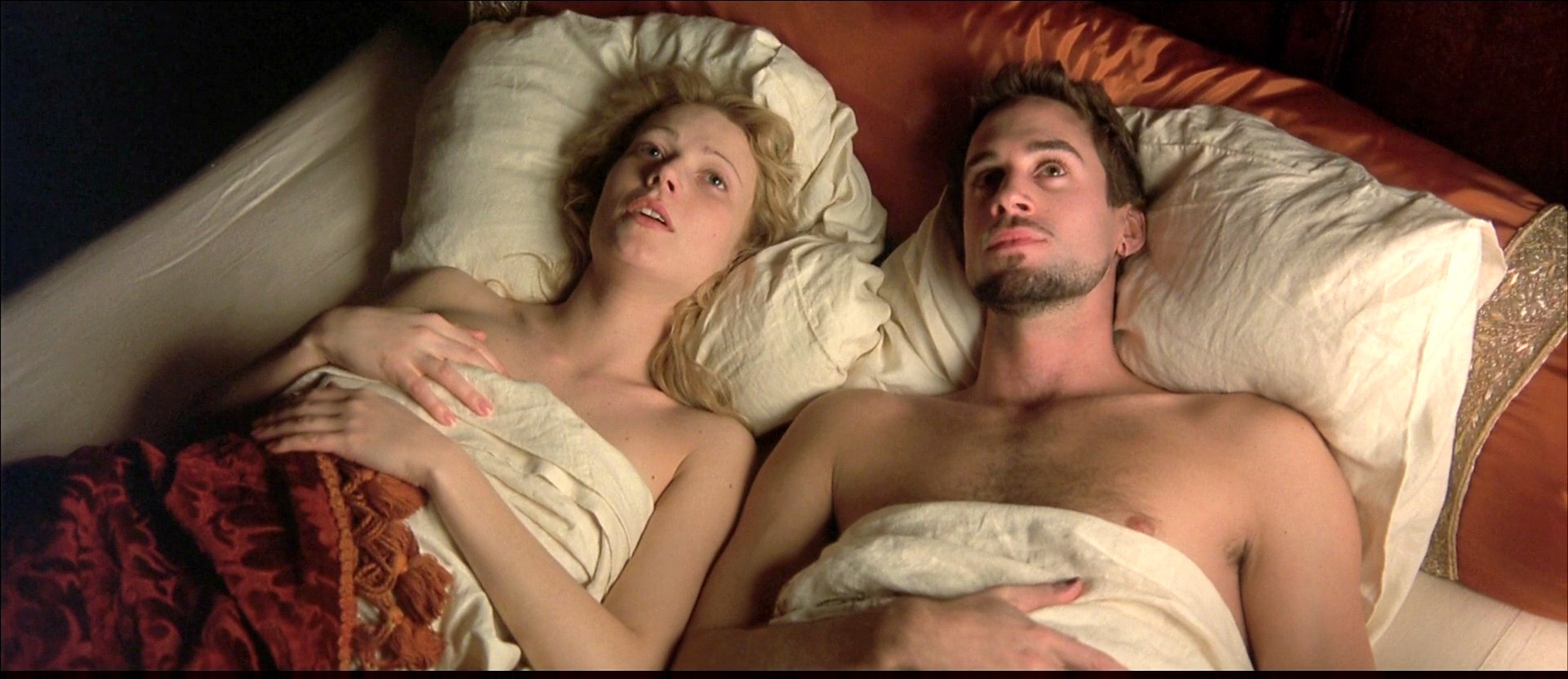 The image comes from Shakespeare In Love, showing one of its many ridiculous scenes of post-coital bliss. Ms. Paltrow’s character never existed, and even if she had, she was nothing like the powerful, angry, sensuous and vengeful Dark Lady described in Shakespeare’s Dark Lady Sonnets.