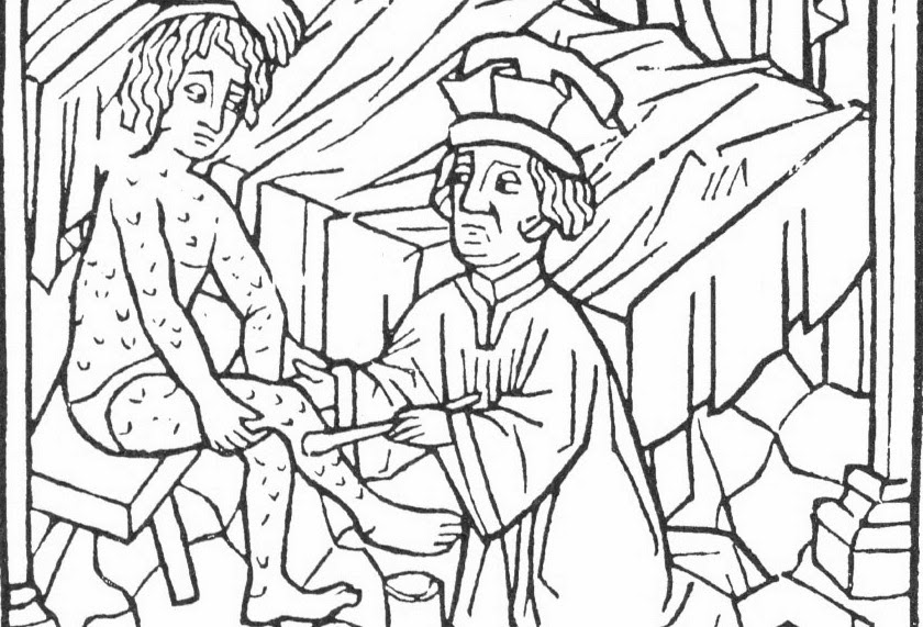 The image is from an anonymous woodcut, circa 1500, of a physician treating syphilis.