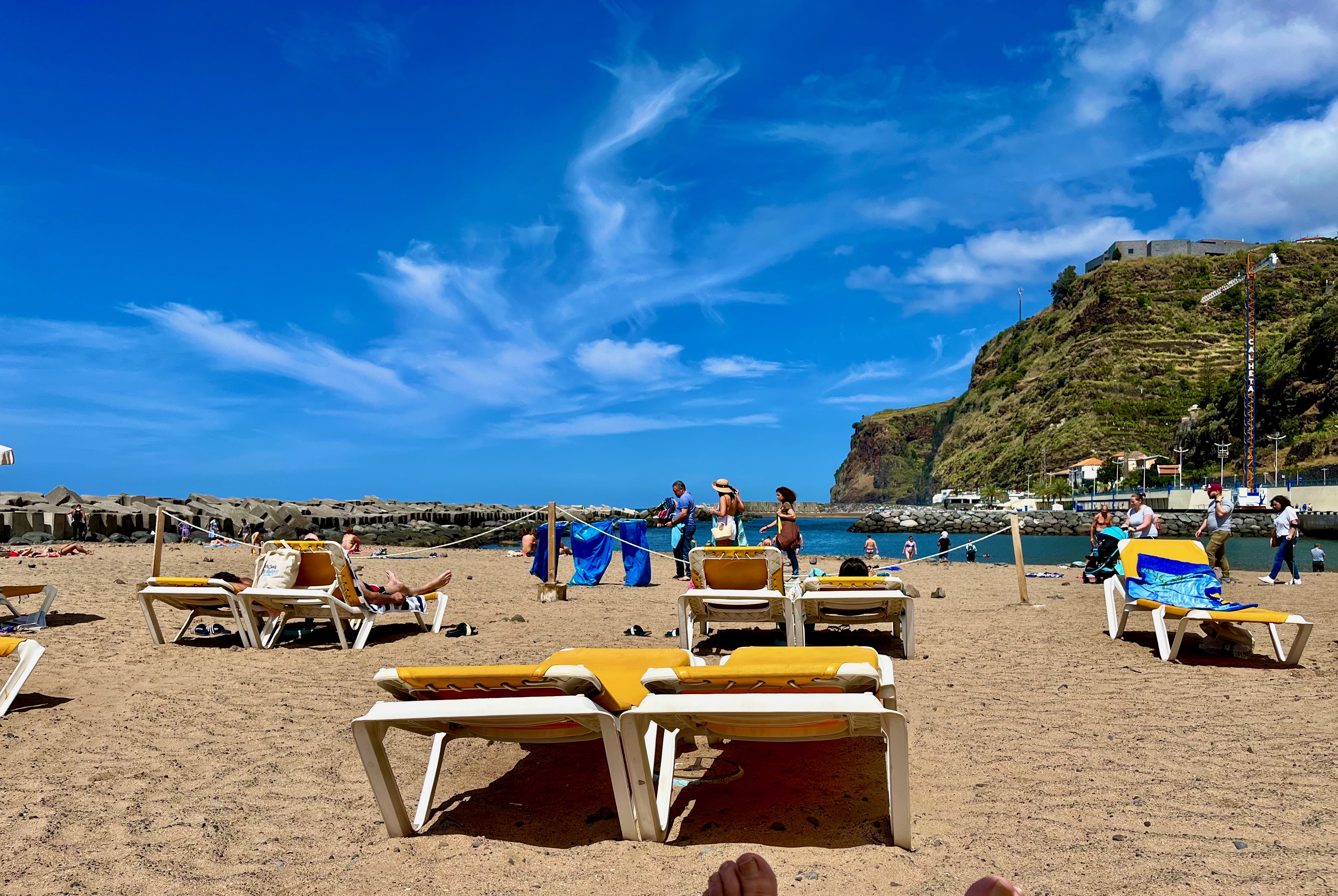 Relaxing at the beach at Calheta. Calheta has the largest sand beach on Madeira. Seawalls were built in the shape of two horseshoes and then sand was imported. It works and it’s very nice.