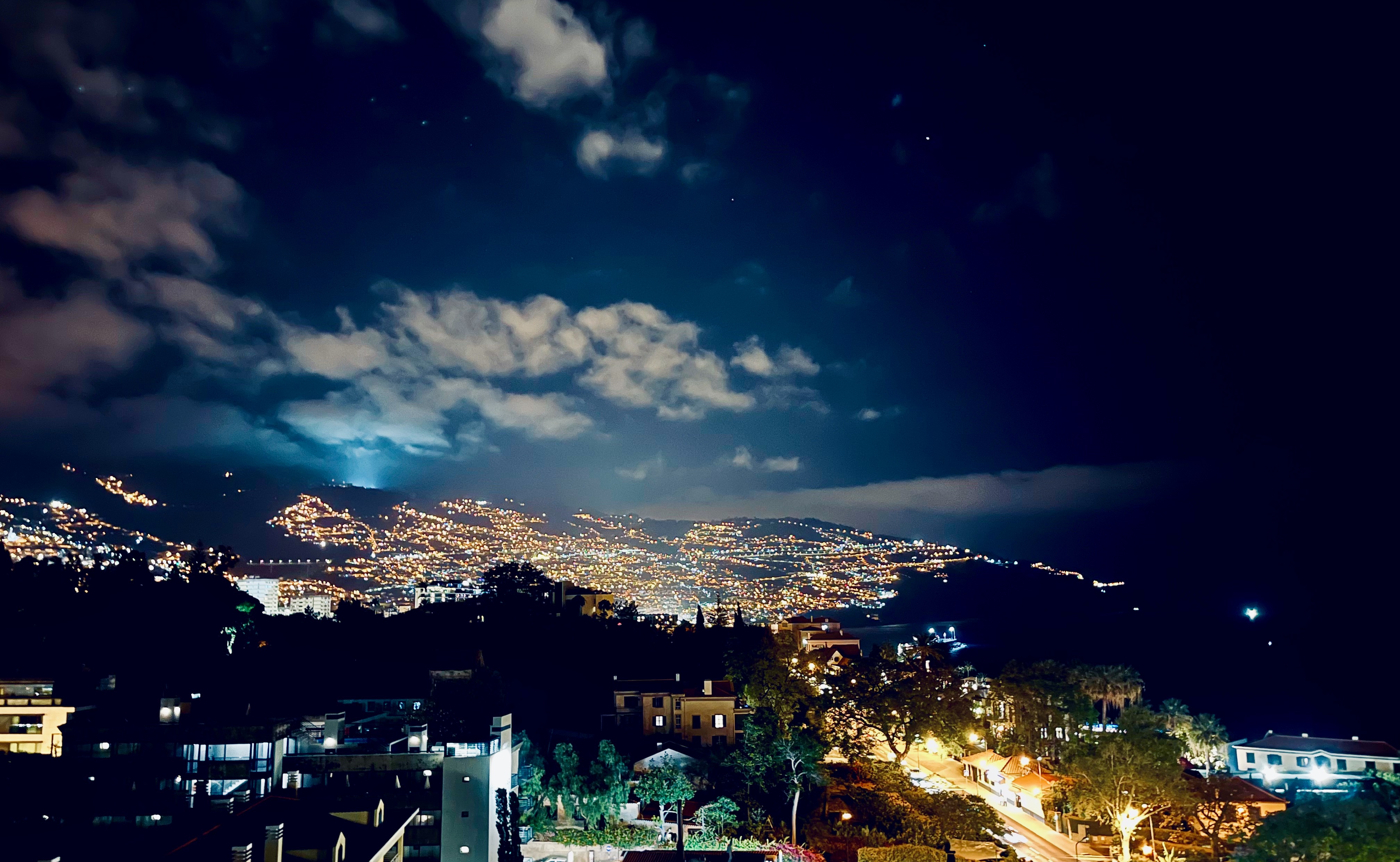 Just left of center, the eerie blue light pluming into the sky are stadium lights from Funchal’s soccer field. There is so little flat terrain in this city that they had to build the stadium high up in the hills where they could just level off the cap of a peak.