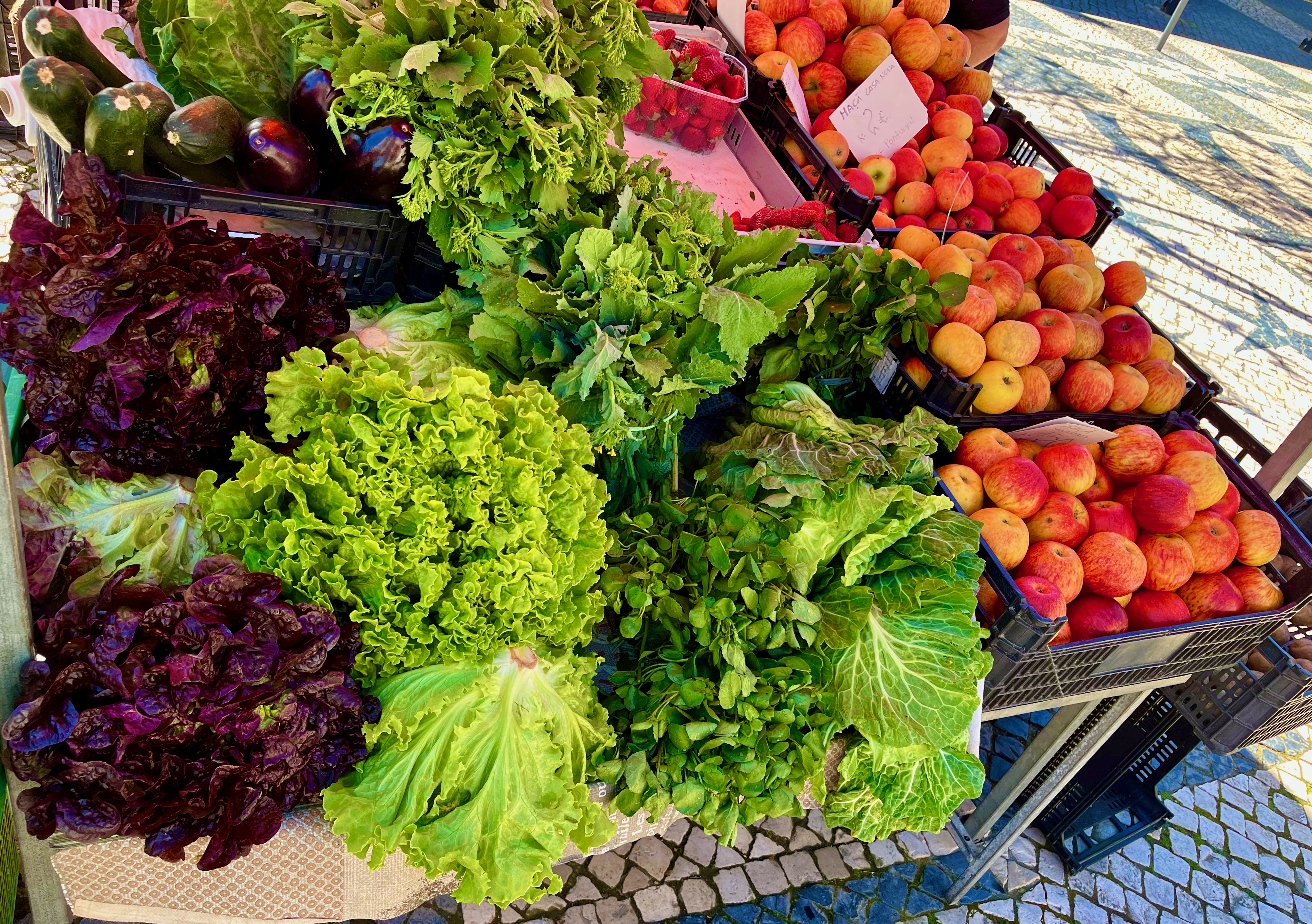 This is a Mediterranean climate and so the vegetables and fruits grown locally are amazing and sumptuous. And because it’s Portugal, they’re ridiculously inexpensive. The farmers at the stands were very kind of to us Americans. I still haven’t completely figured out Euro coins, and the farmers tend to mumble or quickly speak the prices in Portuguese. They’ve become used to the custom of foreigners holding out a palm of coins; they pick out the needed amount. All of them have been very gracious. “Thank You” in Portuguese is Obrigato (or Obrigata if the speaker is female). You learn that word very quickly. And they respond, “De nada.”