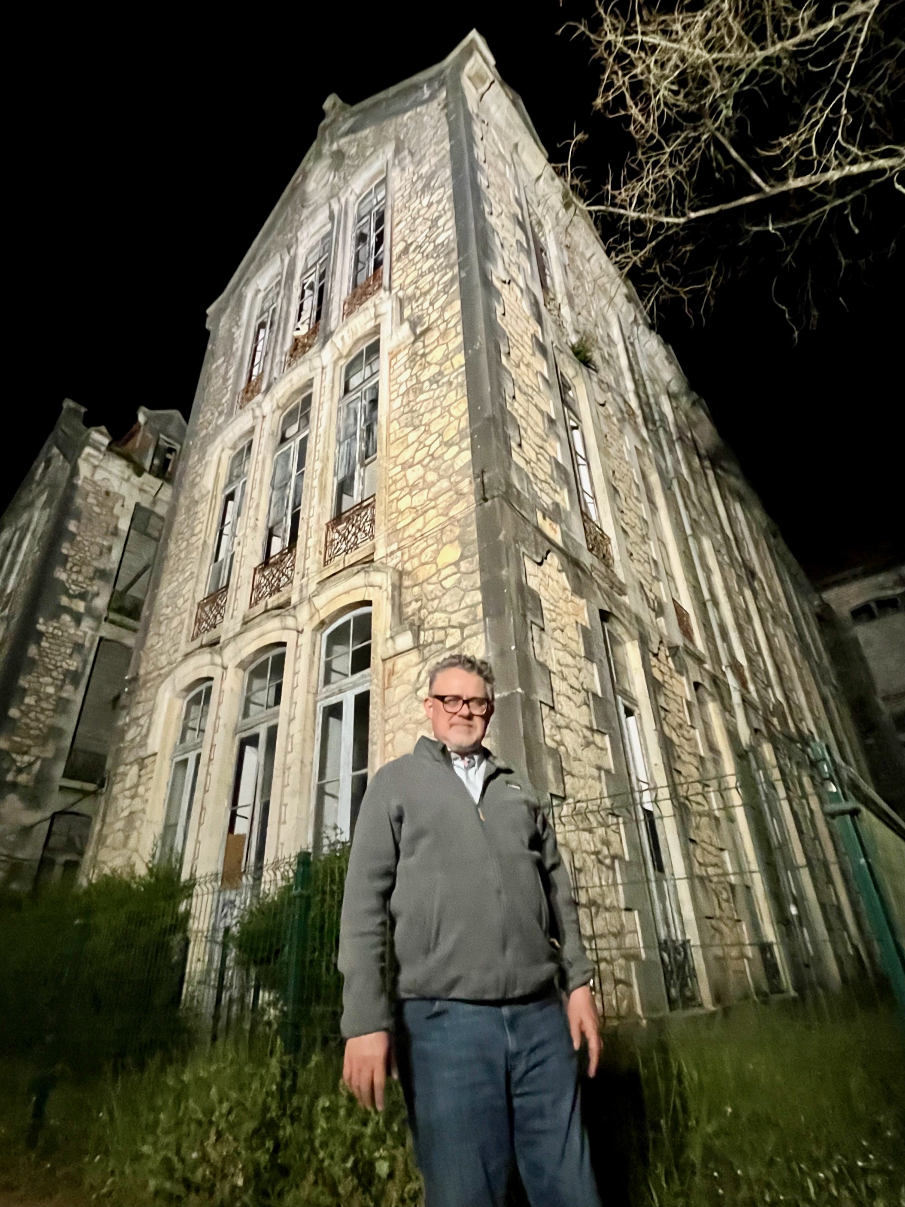 A nighttime shot of Yours Truly in front of Don Carlos’ magnificent ruined hospital.