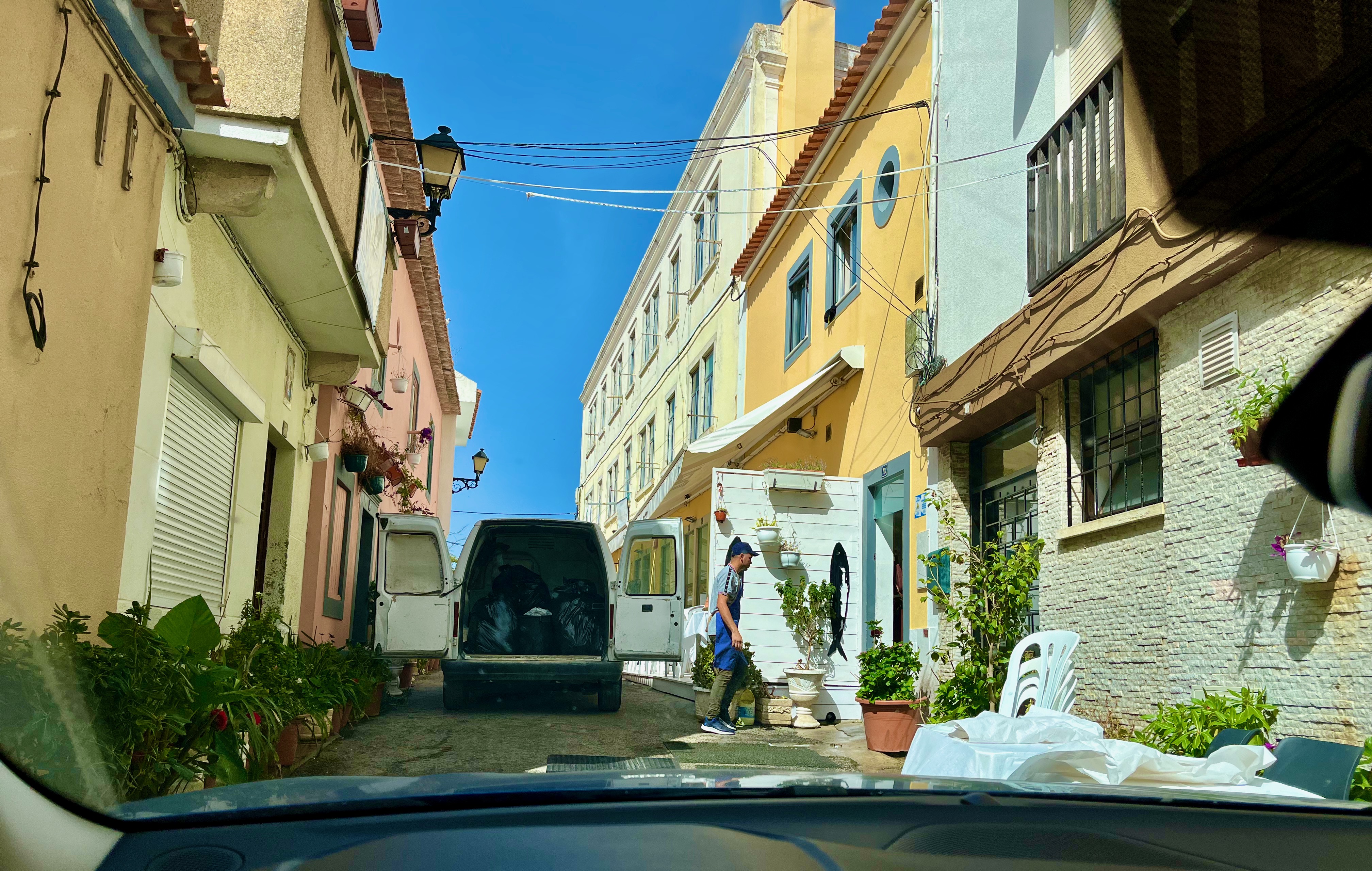 Here’s an example of how narrow and congested streets can get in town. These Portuguese towns are older than my country’s founding, and so the streets are carryovers from an era well before before cars. When you’re driving around you must be be aware that most streets are one-way (and Google doesn’t always know that) and are utilized not only as a street, but as a sidewalk and often as space café chairs and tables. And from time to time you’ll just have to wait while somebody unloads a delivery.