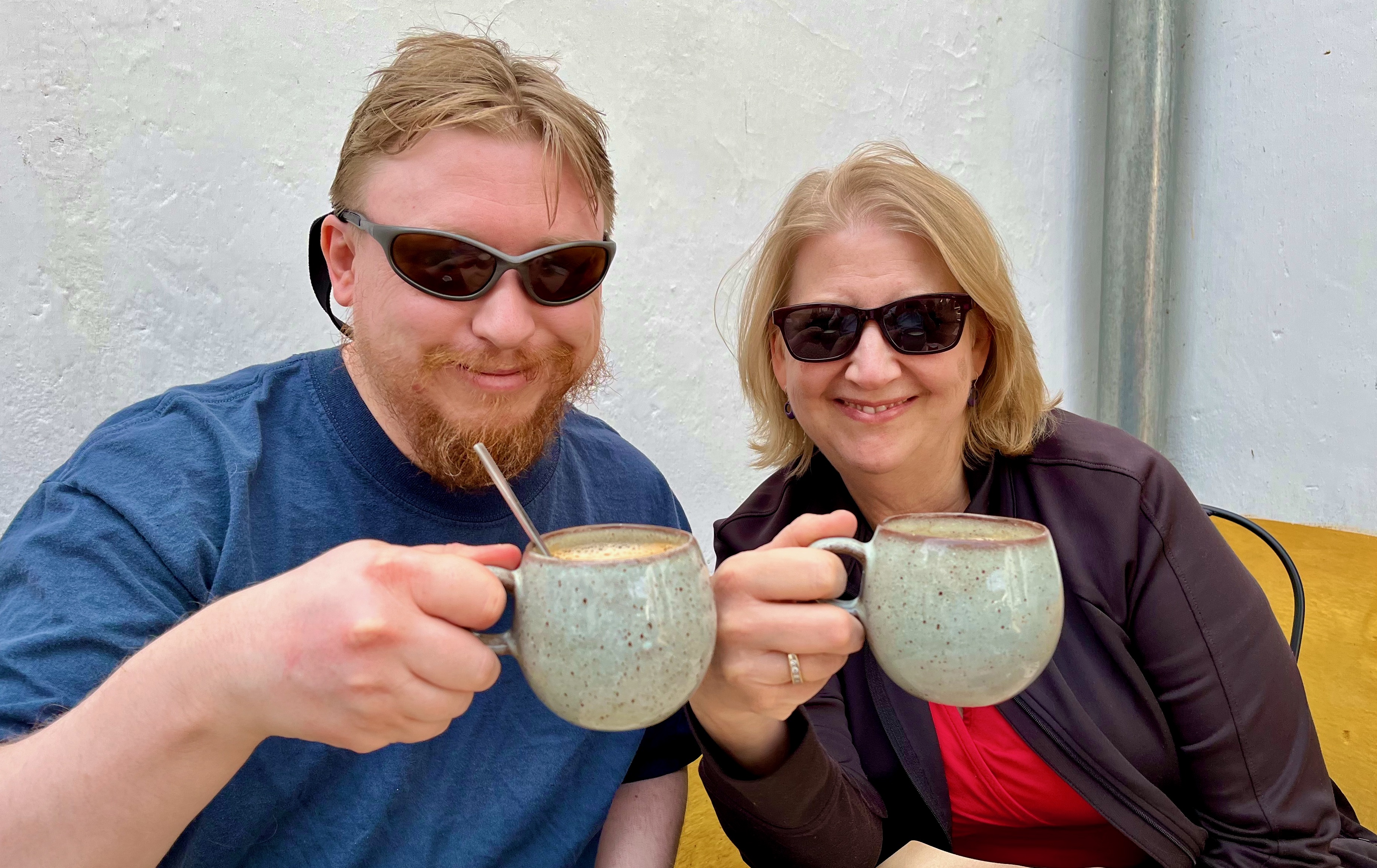 After several days in the Silver Coast, Mary’s son Sam flew in to spend a few days with us. Here’s Sam with Mary taking in additional caffeine infusion to ward off the effects of jetlag.