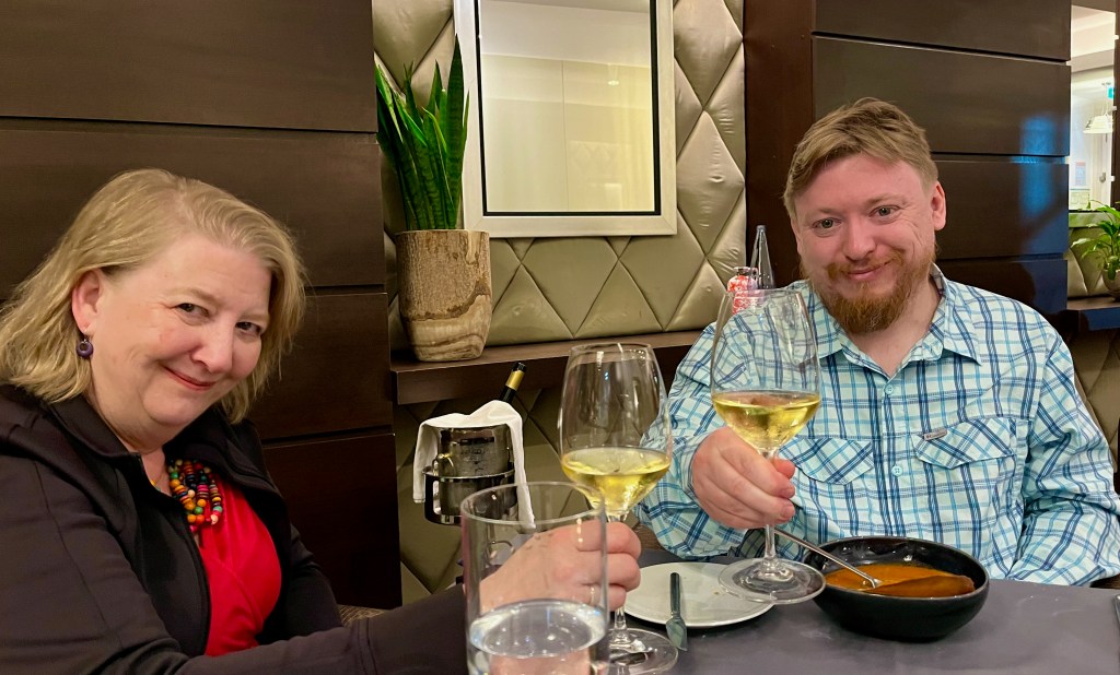 We took Sam out for a birthday dinner at the finest restaurant in Caldas da Rainha. Google translator on your smartphone is often very helpful with menus. We are toasting with a Portuguese specialty wine, vinho verde.