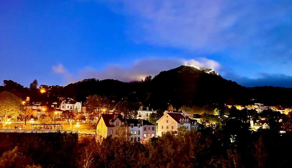 At the top of the mountain shines the the Pena Palace. We visited there a year ago, and if you ever come to Portugal, it’s worth seeing. It’s the one castle in the country that is not authentic; it’s very Disneyesque. And so it gets lit up at night, which has this unintended otherworldly effect when the mountaintops mist over.