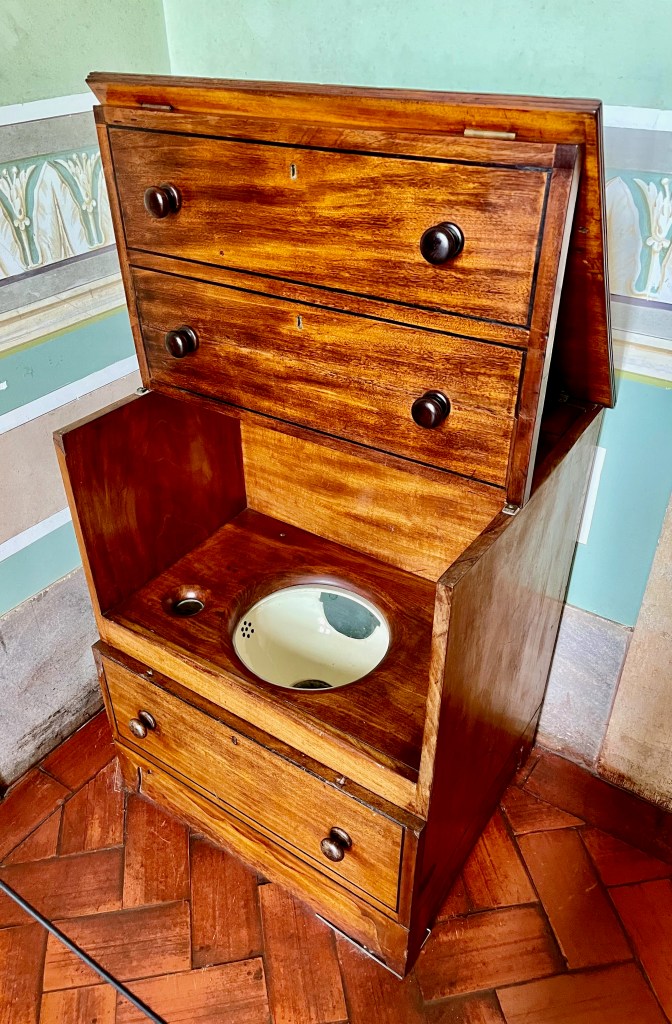 King John V’s personal commode. As the King, he got to use a lovely cabinet to do his business in, and had servants or chambermaids carry away his mess. Most commoners did their business in pots which were then dumped into cesspits in their gardens. In the cities, “Night Soil Men” were tasked with hauling the waste to dumps outside of cities. Kings and Queens didn’t have to bother with any of this.