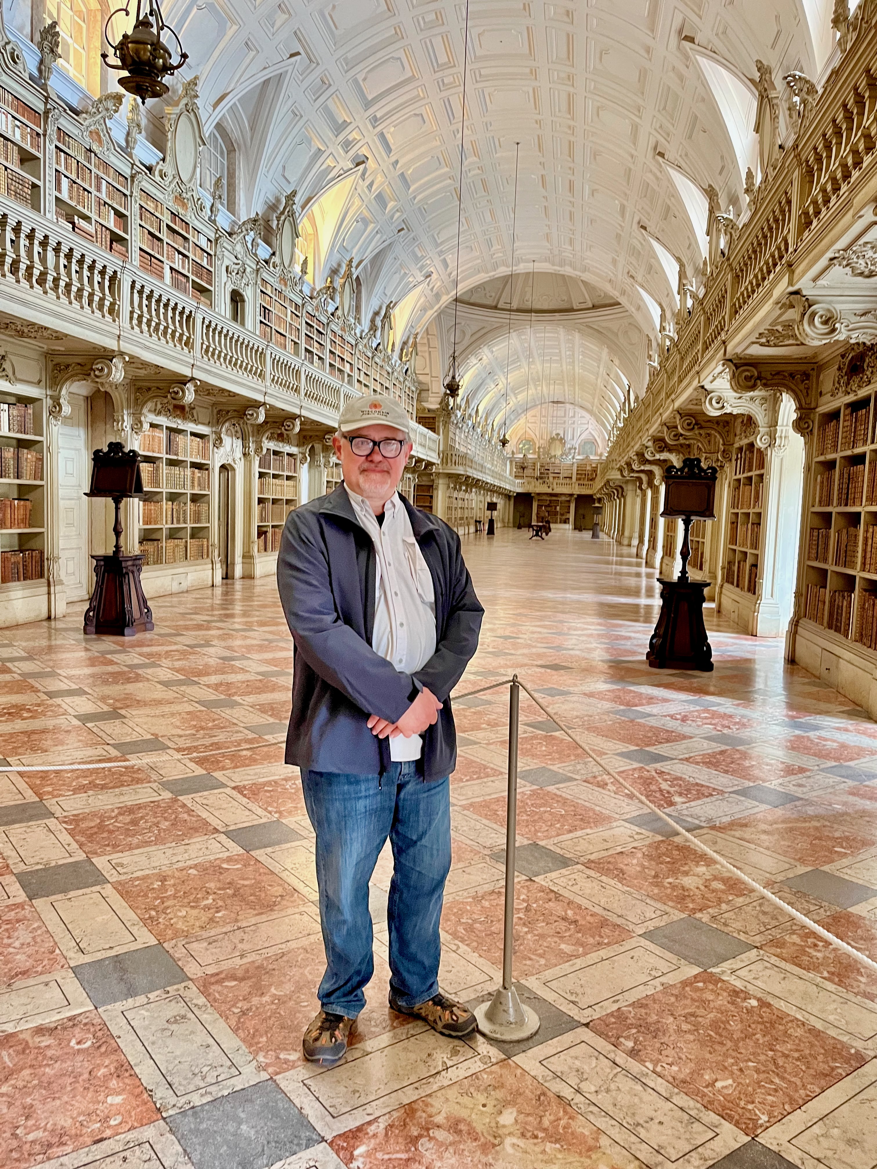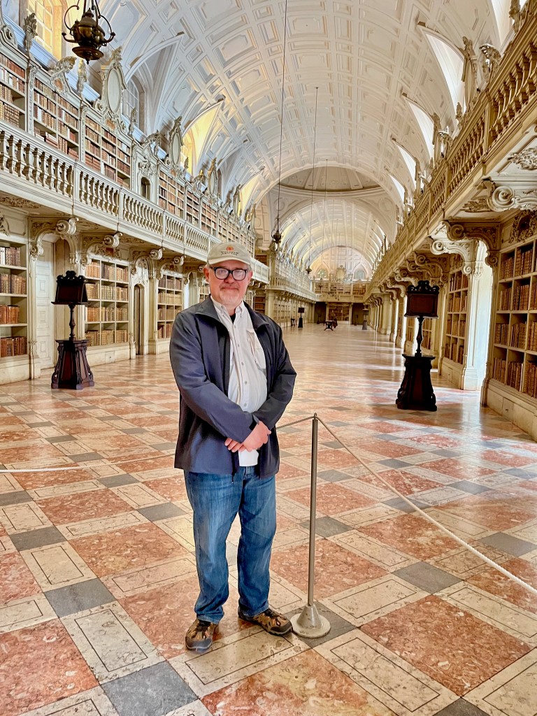 Yours Truly in the Mafra Palace Library. This library holds 36,000 volumes of rare books spanning from the 14th to the 19th centuries. Old books like these are susceptible to paper-eating insects. Not to worry, hundreds of bats live here. At night they scurry about eating the vermin. In the morning, workers come in and sweep away all the bat guano.