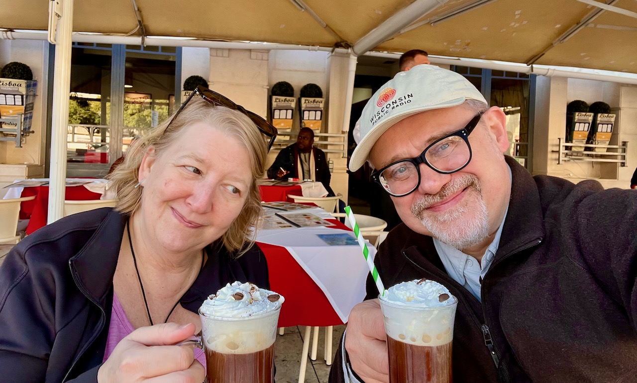 Here’s Mary and Yours Truly sitting at a sidewalk café in downtown Lisbon, enjoying Irish coffees. We needed the caffeine boost to help ward off jet lag.