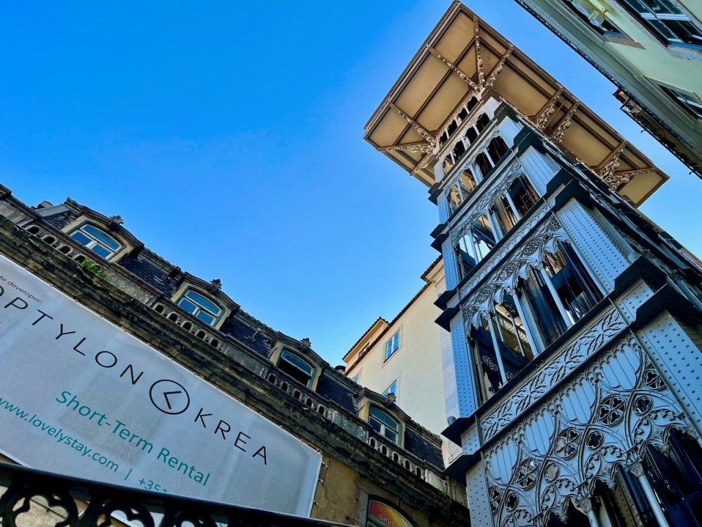 Lisbon’s origins may go back to Julius Caesar, but today it is a mash-up of old and new. Here’s a steam-punkish tower rising next to an advertisement for new apartments. We took an elevator up this metal tower, which is how I got the two previous shots.