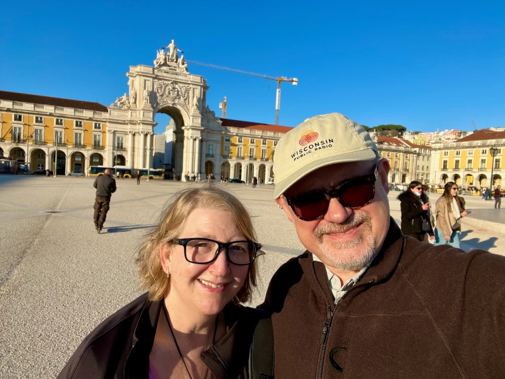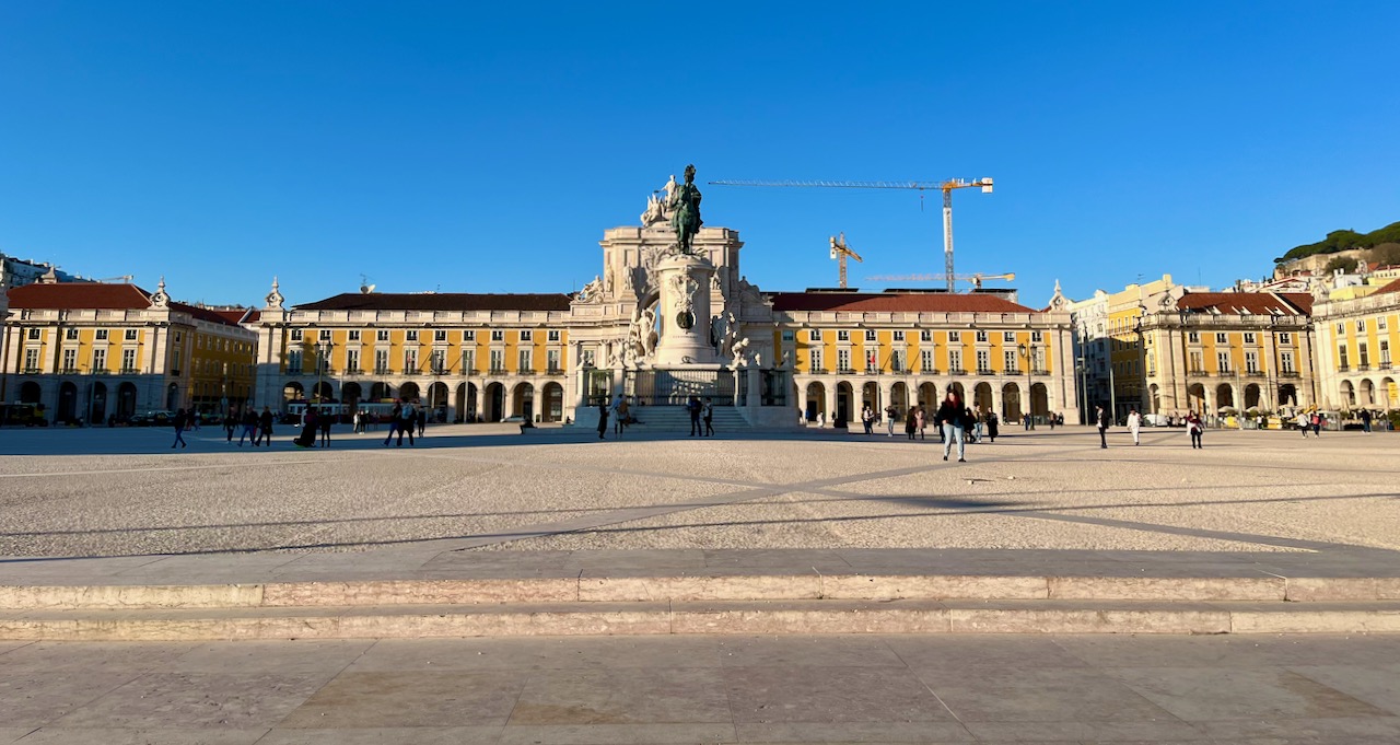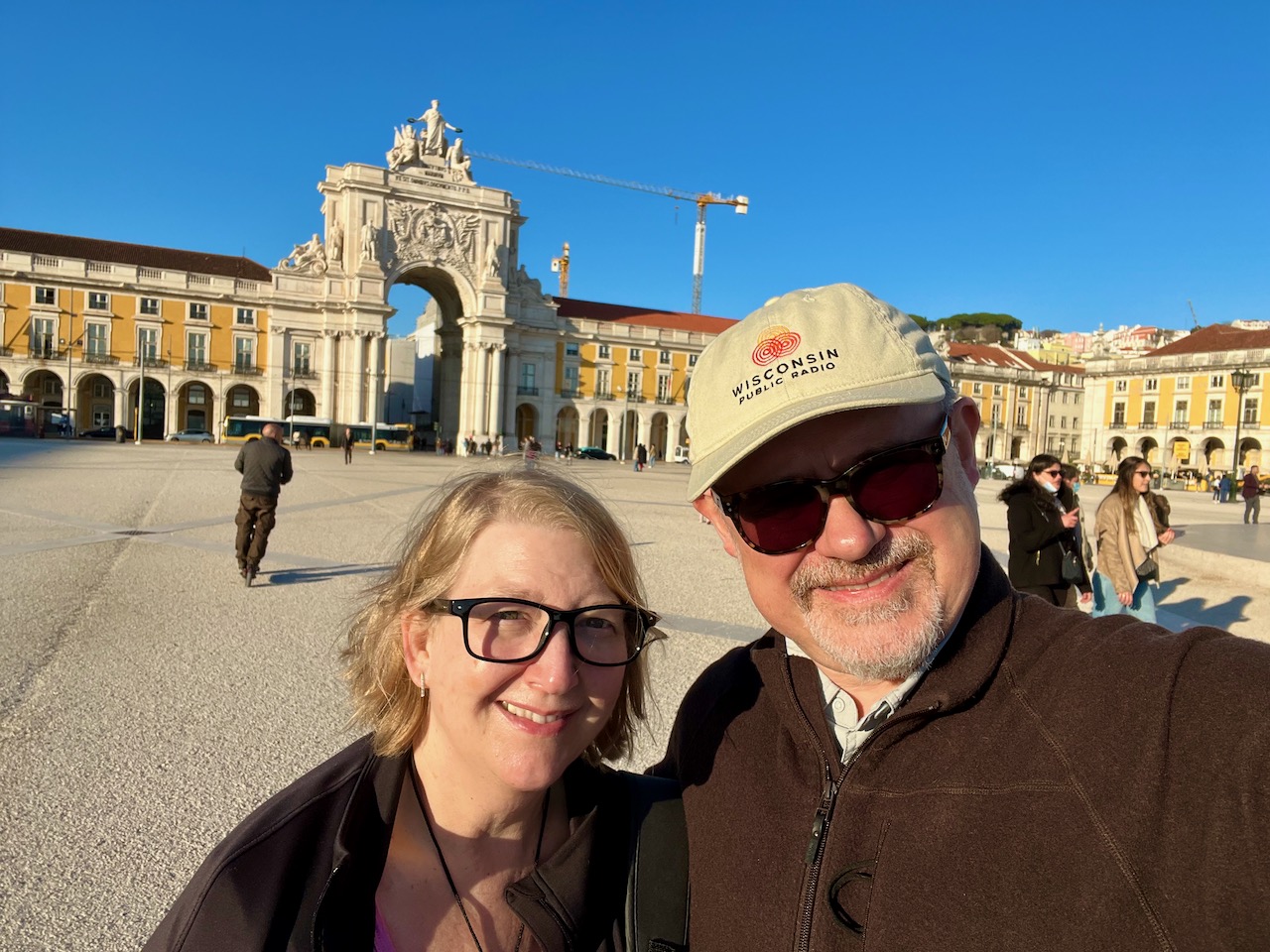 Mary and me basking in the glorious January sun at Praça do Comércio, Lisbon.