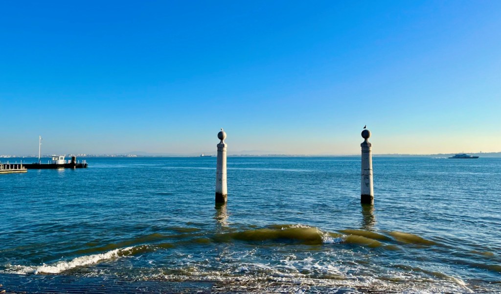 Cais das Colunas, the unofficial entrance to Lisbon Harbor on the Targus River. These two columns were erected after the 1755 earthquake and corner a set of marble stairs (which were submerged in the tide when I took this shot).