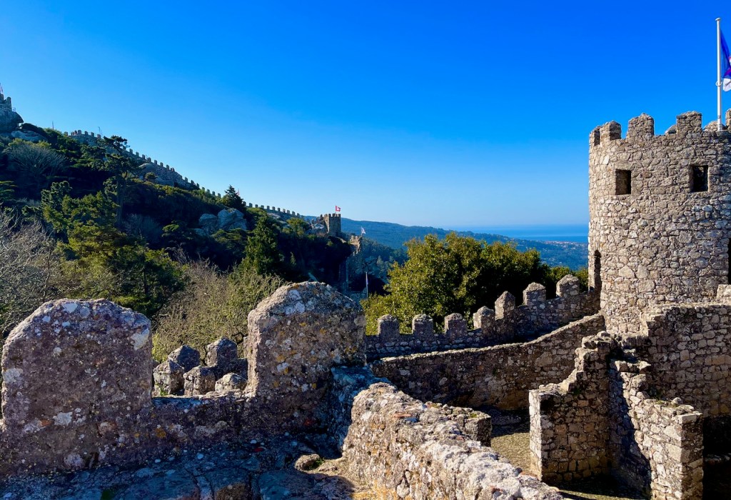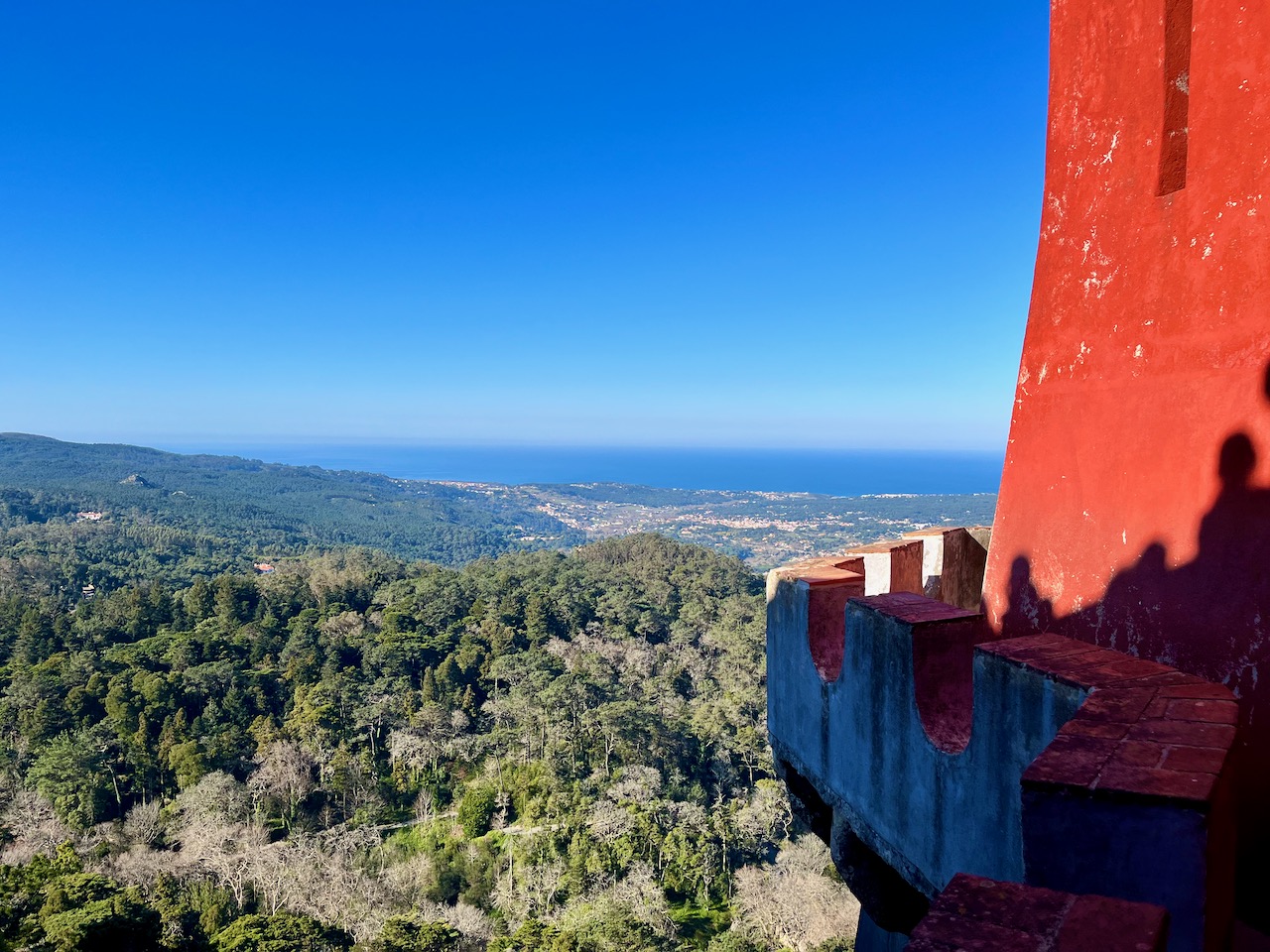 From Pena Palace you can see for miles in every direction. And if you’re brave enough, you can walk along the ramparts. Here’s a nice view of the Portuguese countryside with a view of the Atlantic Ocean.