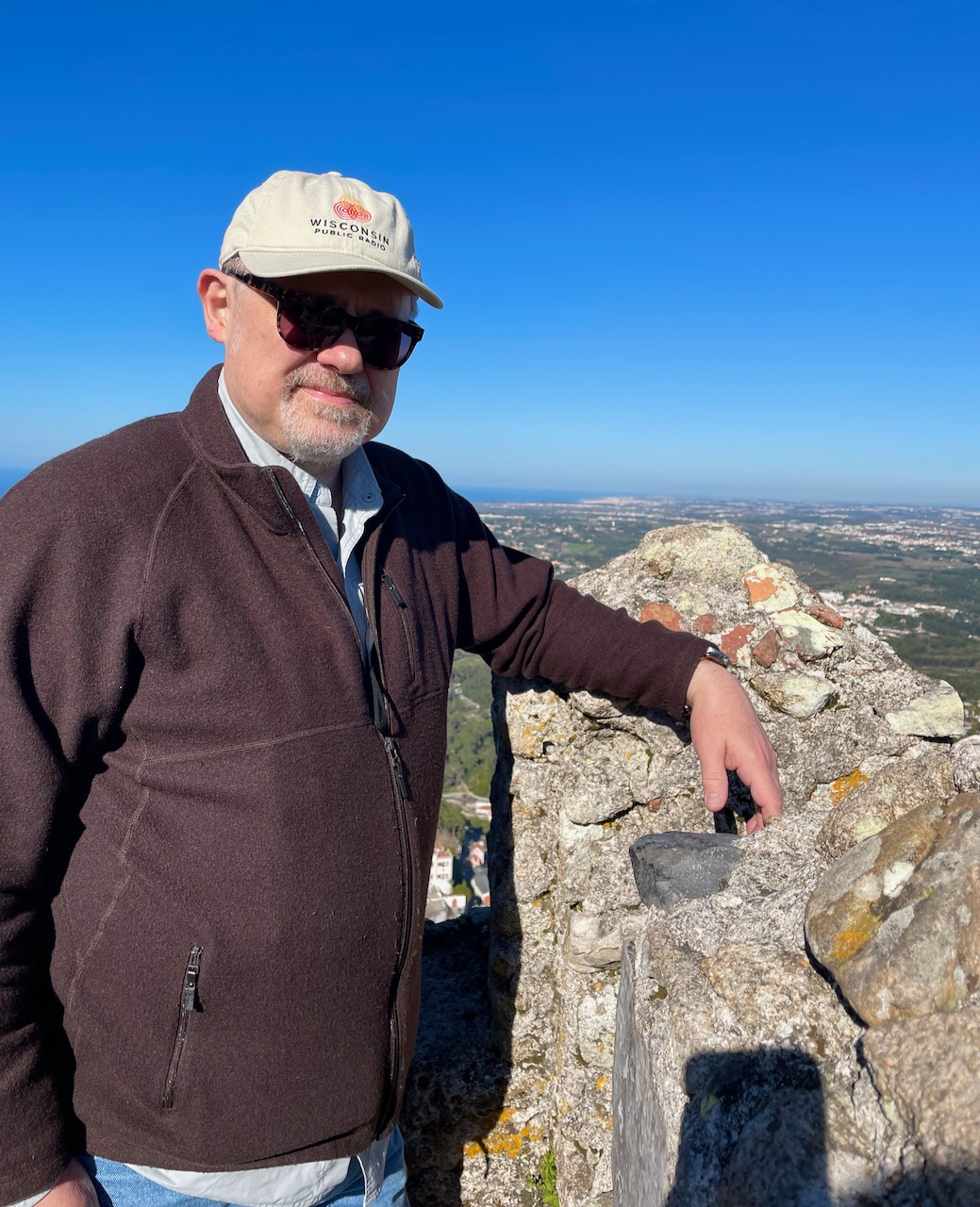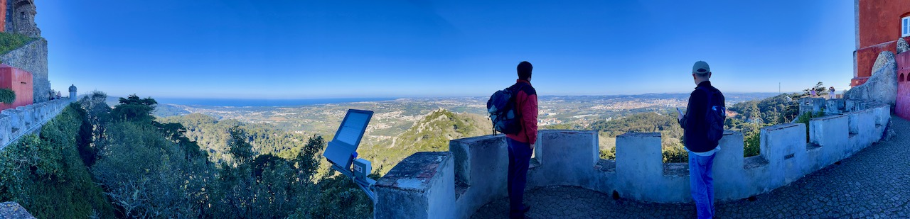Mary took this marvelous panoramic shot along the ramparts of Pena Palace. Left of center is a solar-powered light. Right of center stands Yours Truly, gazing out over the landscape.