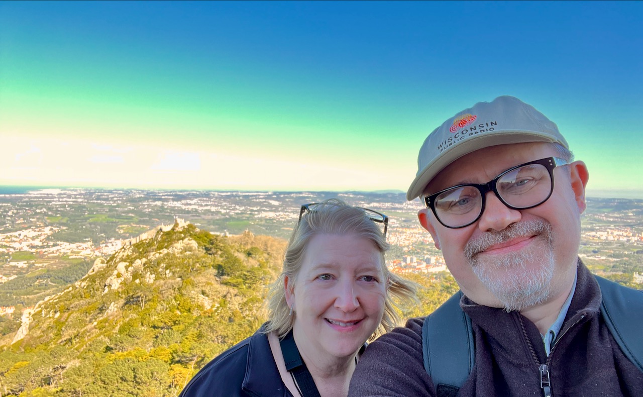 My sweetheart Mary and me atop the heights at Pena Palace.