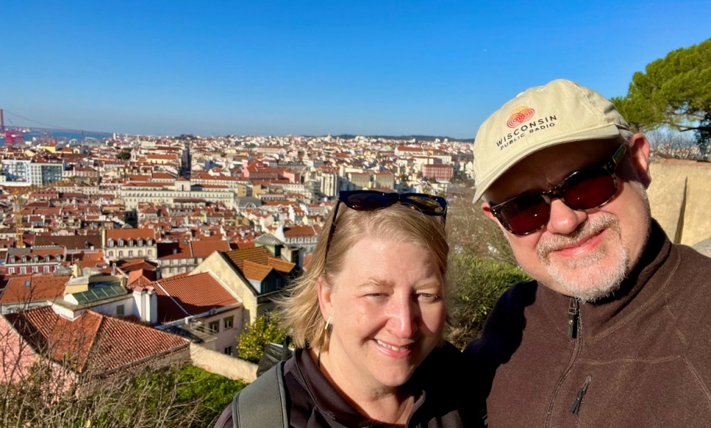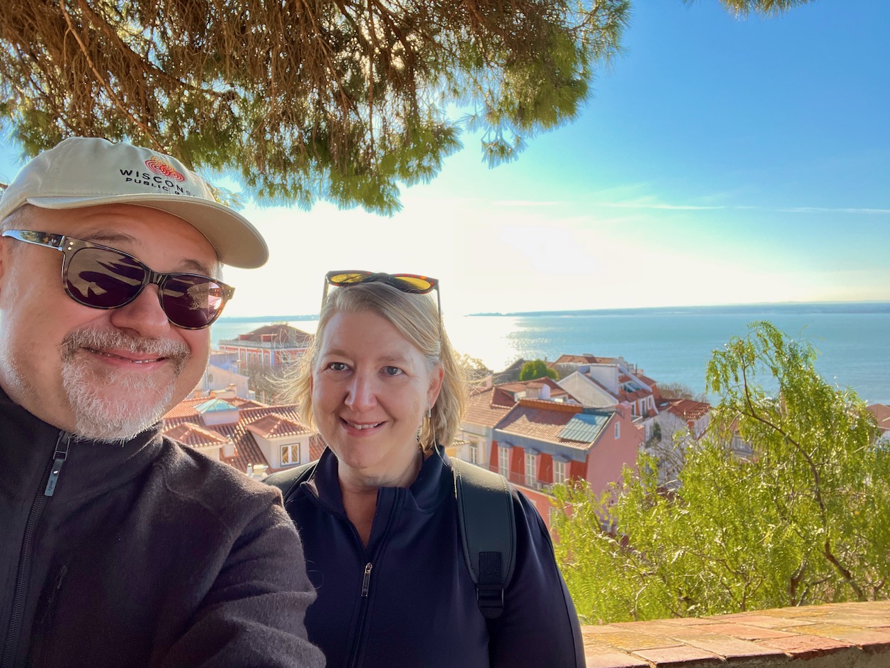 Mary and me on the Castelo de São Jorge plaza with the rooftops of Lisbon and the Tagus River below us.