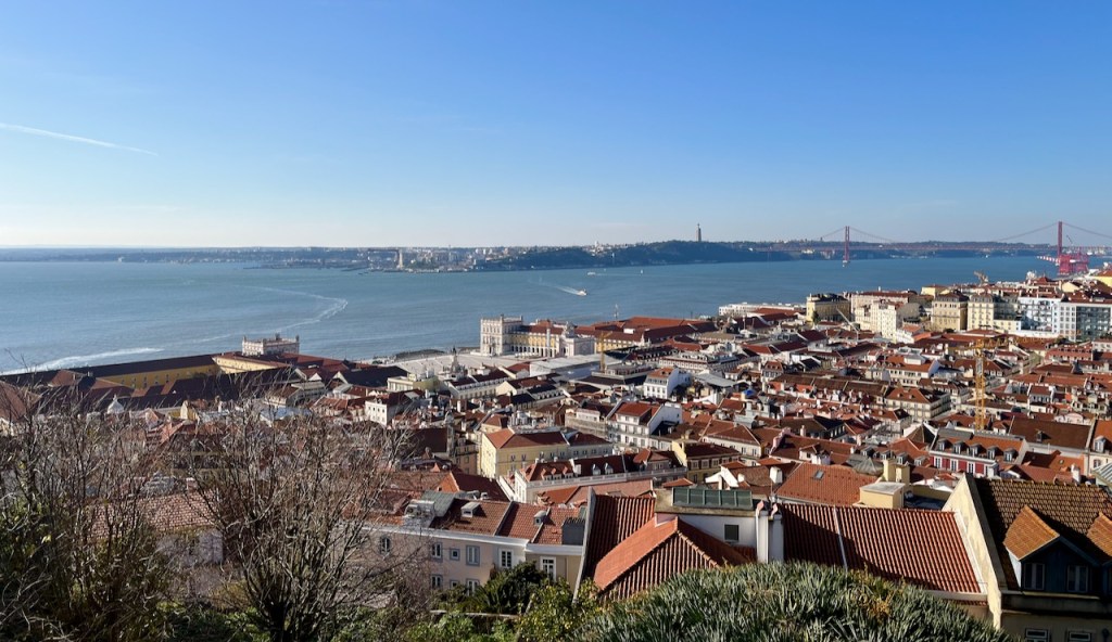 The view from the plaza outside Castelo de São Jorge. To the right you can see the Ponte 25 de Abril Suspension Bridge, which crosses the Tagus River shortly before the river empties into the Atlantic Ocean.