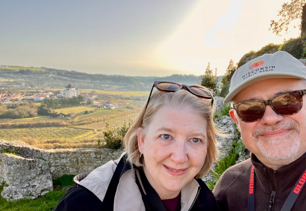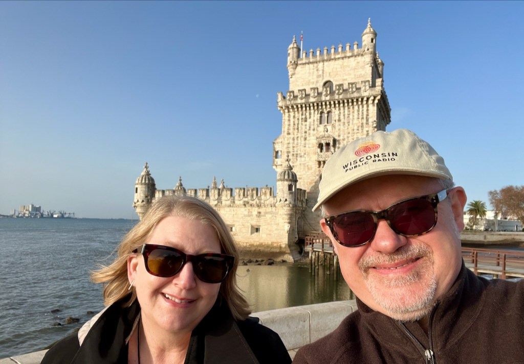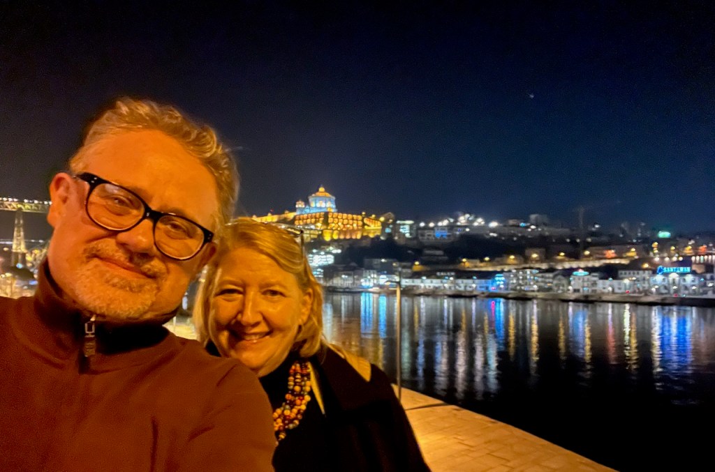 Mary and me in the chilly sunrise above the rooftops of Lisbon.