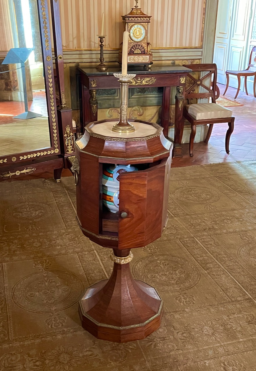Recall that I mentioned the royal family fled when the French invaded Portugal? In 1807 the French army invaded Portugal, led by Jean-Andoche Junot, 1st Duke of Abrantes. Abrantes immediately began to prepare the palace for a visit from his conquering hero, Napoleon. It’s said that Napoleon refused to sleep in any bed that had been used by another person. So Abrantes moved in a whole new set of bedroom and bathroom furniture into one of the palace’s state rooms. Alas, Napoleon never made it here, but his chamber pot still remains. Yes, this is, indeed, the chamberpot of Napoleon.