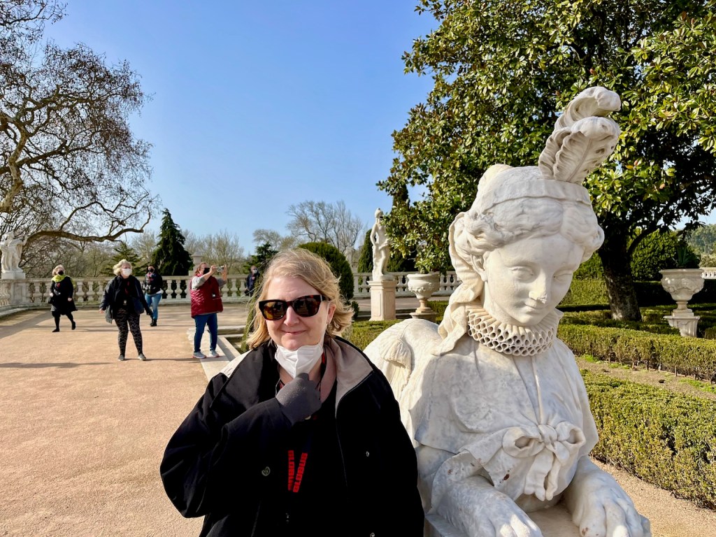 Mary hamming it up with one of the Lewis Carroll-like statues in the palace gardens.
