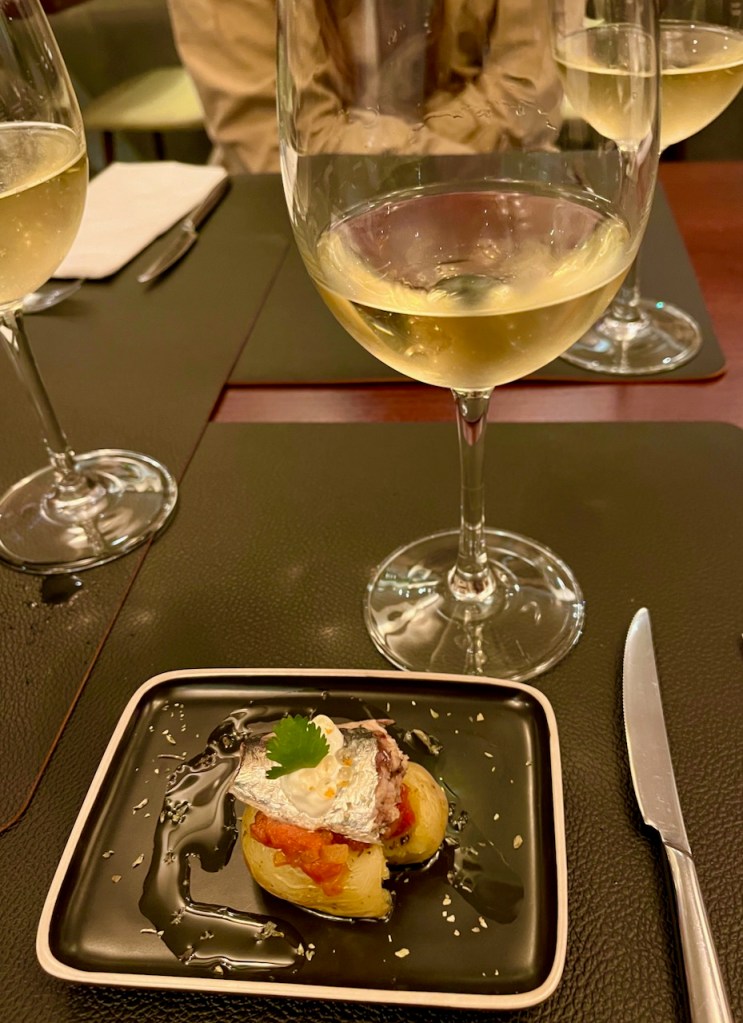 Our next restaurant served us a tapas of marinated pig cheeks atop garlic bread. The chef recommended a red wine.