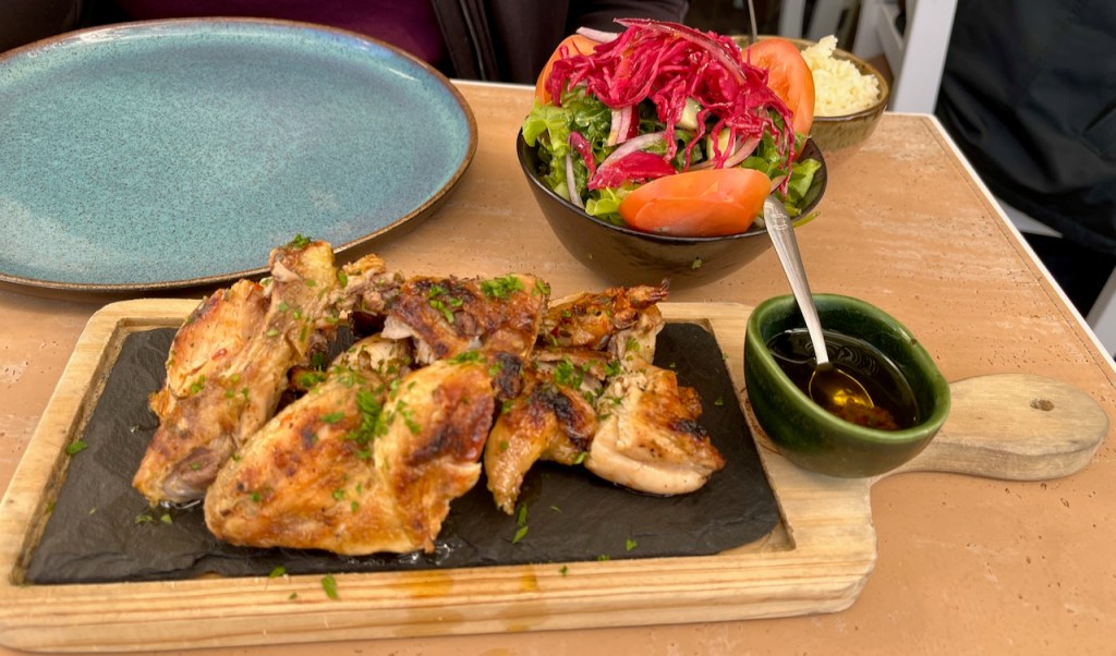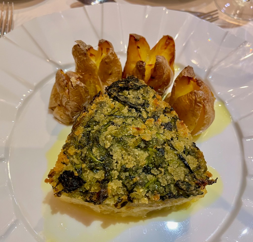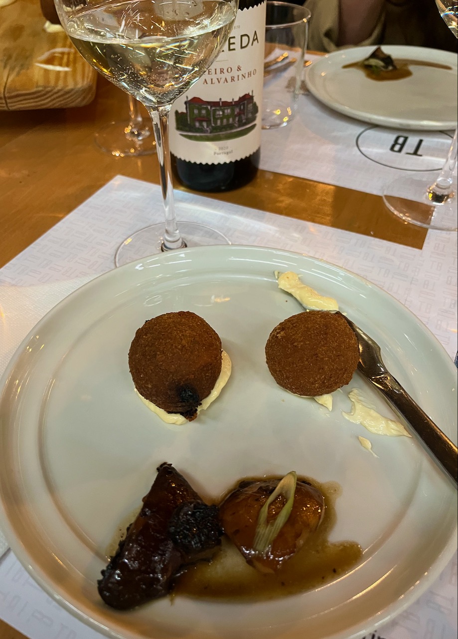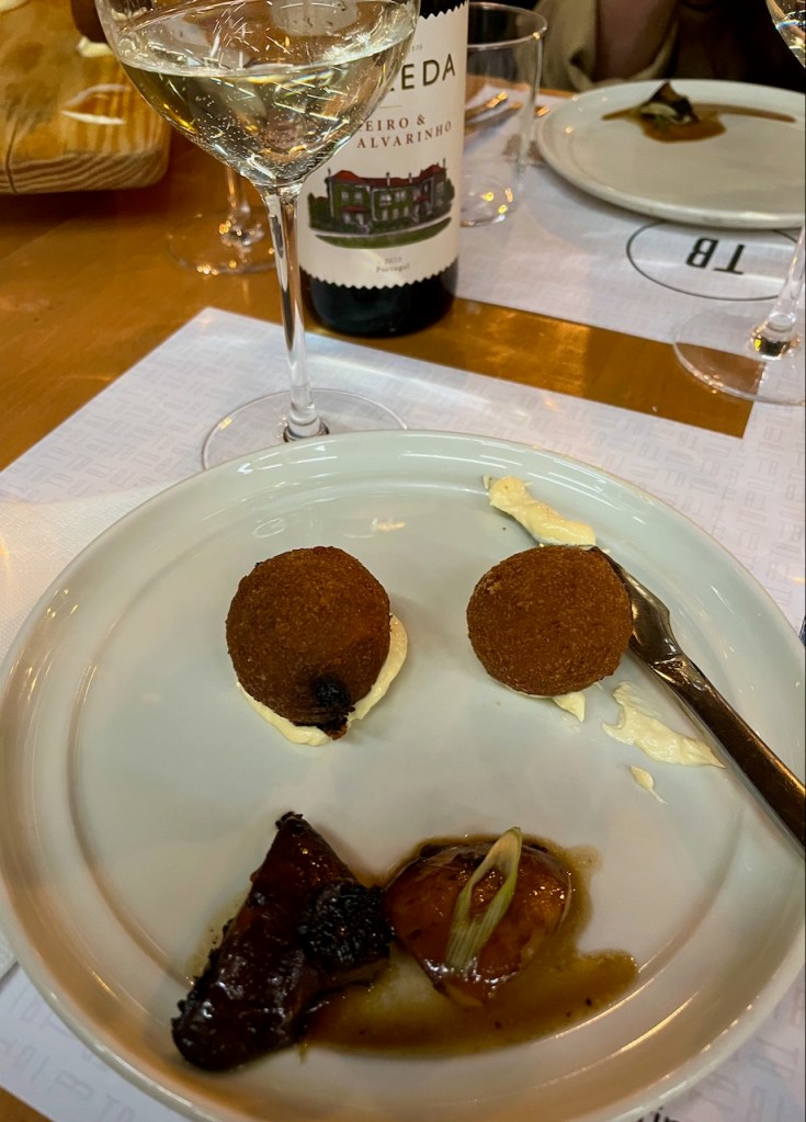 The ball on the left was a squid ball. Inside the squid was pitch black; when Portuguese serve squid, they make sure to color it with squid ink. It’s rolled in a fine batter and deep fried. The ball on the right was a ‘Jewish ball’, made out of chicken sausage, celebrating the history of Jews moving into Portugal in medieval times to escape persecution. Jewish families would take chicken and color it with paprika and then make it into sausage. When Christian church leaders would come to Jewish households to see if the Jewish families had converted to Christianity, the easiest way to check was to see if they were now eating pork. The paprika-colored chicken would fool them.