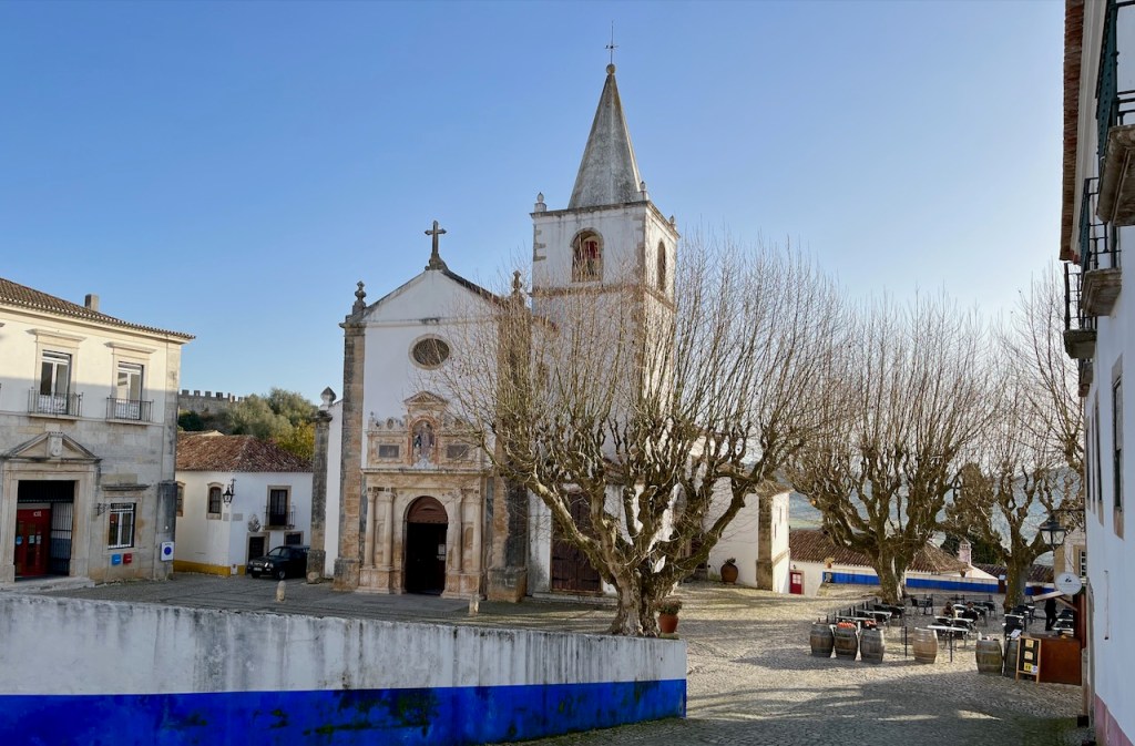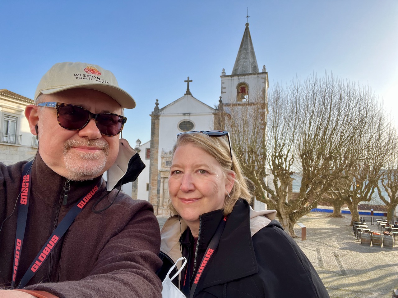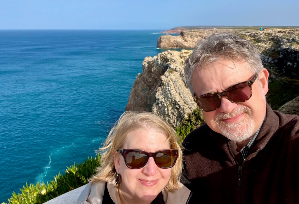 Just behind the Igreja de Nossa Senhora da Graça, the cliffs on this peninsula plunge almost 200 feet to the Atlantic Ocean. Here’s Mary and I welcoming the sun, as the wind off the sea on this flat promontory was harsh.