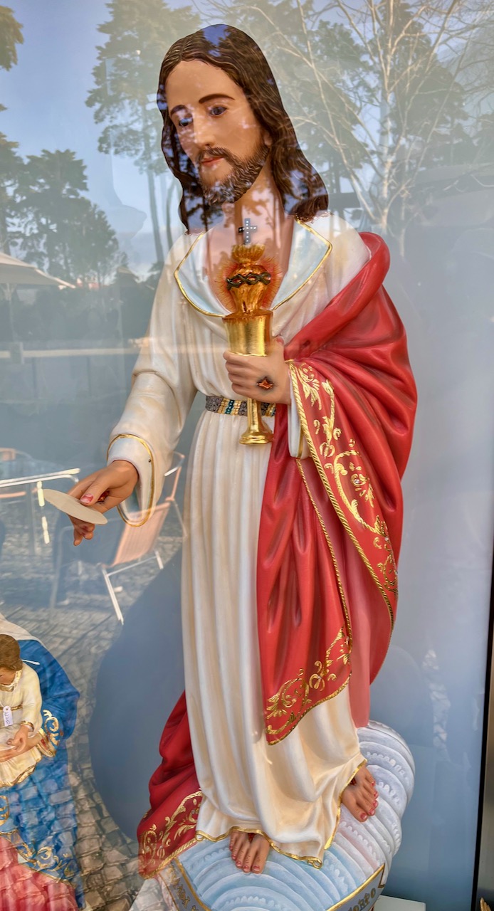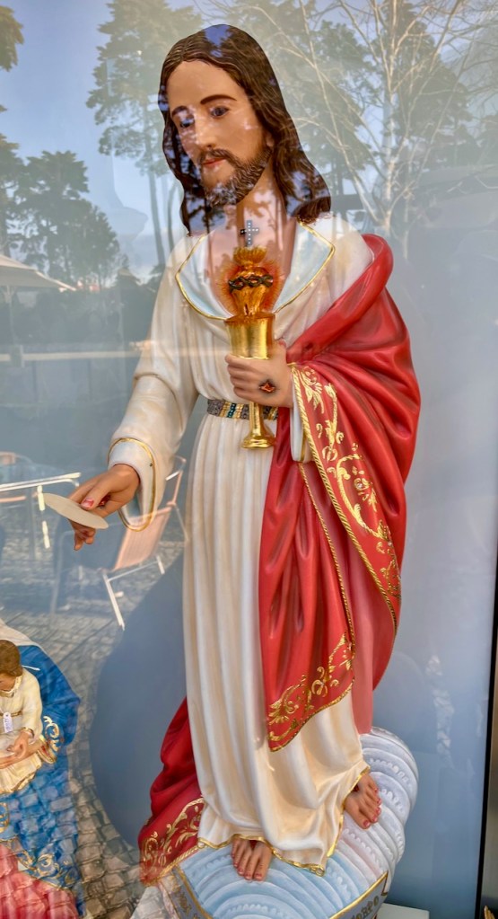 To wit: Jesus is holding a cup of sacramental wine from the Eucharist. Um…this is the blood of Jesus. And so Jesus is offering you a cup of his own blood to drink. But wait, he’s also holding a sacramental wafer. This is body of Jesus. He’s offering you a bite of his own flesh to nosh on. So what we have here is vampirism, cannibalism and body identity integrity disorder. Hold on, there’s more. Jesus’s crucifixion impalement wounds are lovingly painted in gorgeous detail on his hands and feet. Sorry, this smacks of sadomasochism. Finally, if Jesus did exist in about 30 AD in Israel, he was not pasty white. So we can add racism to list of deviances here.