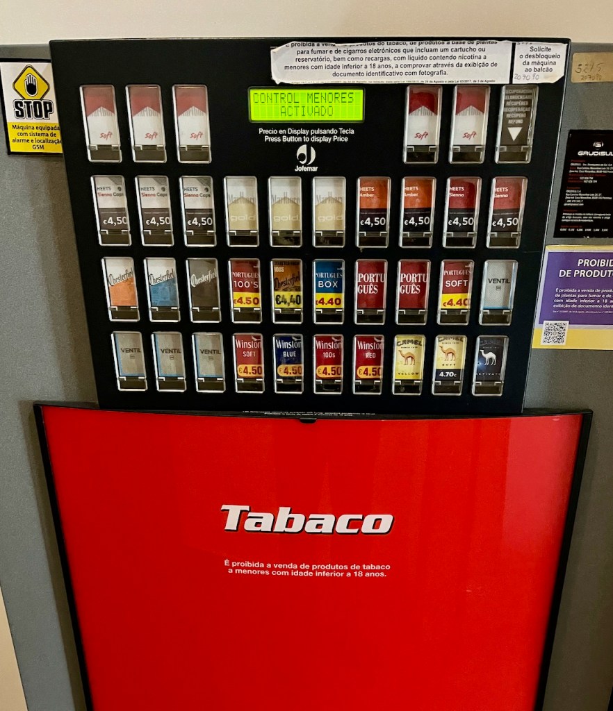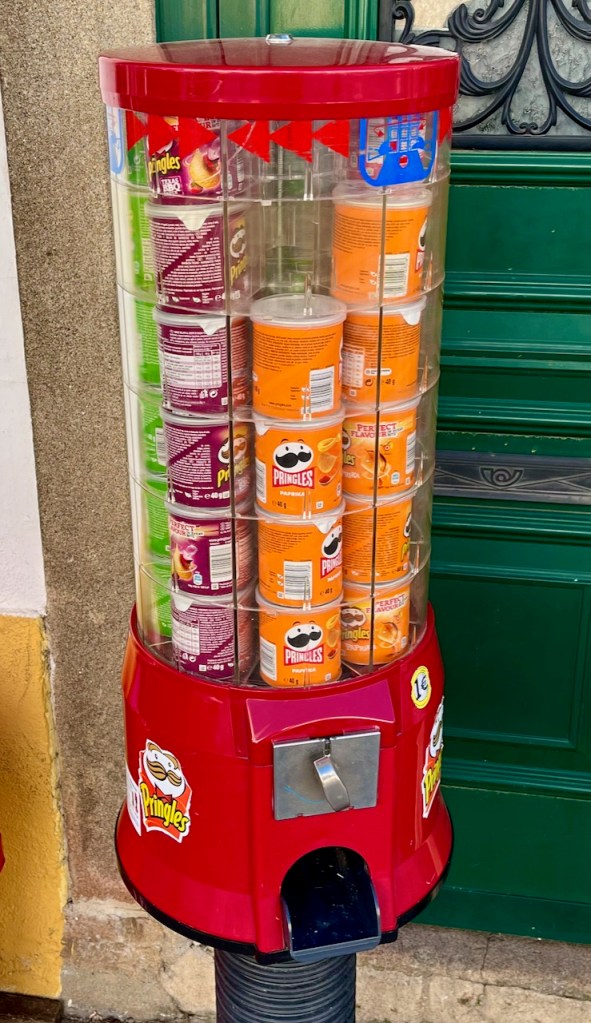 Here’s something about Portugal that surprised me: the preponderance of cigarette smoking. Many restaurants still provide ashtrays, where smoking is still allowed at the outdoor tables. Our villa has ashtrays. And here, in a hotel lobby, I ran into something I haven’t seen in decades: a cigarette vending machine. Look closely, and you’ll see you can get Marlboro, Camel, Winston and Chesterfield. American exports we can be so proud of.