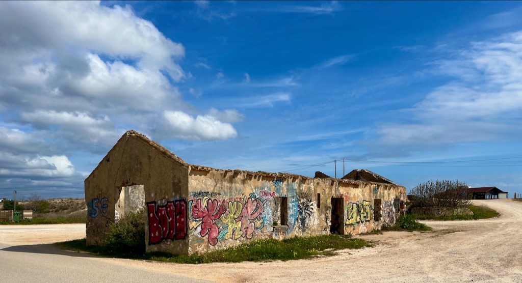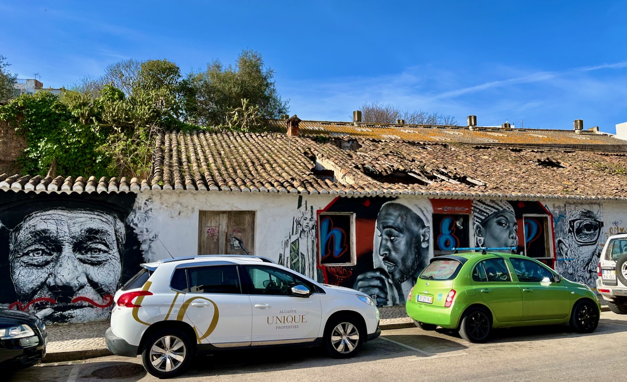Mary and I have now walked into old town Lagos (that is, the part of Lagos from medieval times) a couple of days now, and there’s always things to see and marvel at. The street art or graffiti is often astounding. Pictured: a line of gorgeous street art on a ruined building. I only wish the cars hadn’t been parked here so I could photograph the whole thing.