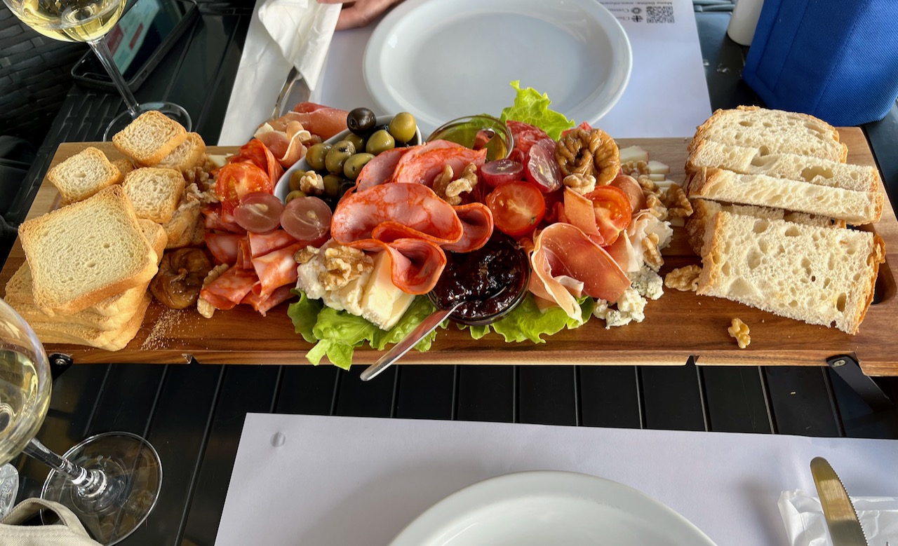 An example of the kind of fare Mary and I can enjoy at the marina ‘bar.’ Yes, it calls itself a bar, yet serves gourmet charcuterie boards like this. Bom appetite!