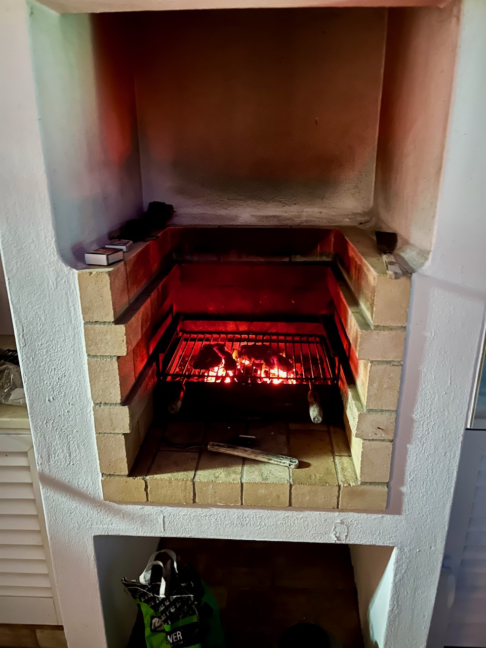 It was a challenge getting the coals to burn. Portugal has a lot of environmental laws, and I suspect that these coals, which would hardly burn, are not made of coal, wood or anything flammable. Likely it’s soylent green. Anyhow, after a lot of work and some help from the broiler inside, we had grilled Portuguese steaks for dinner.