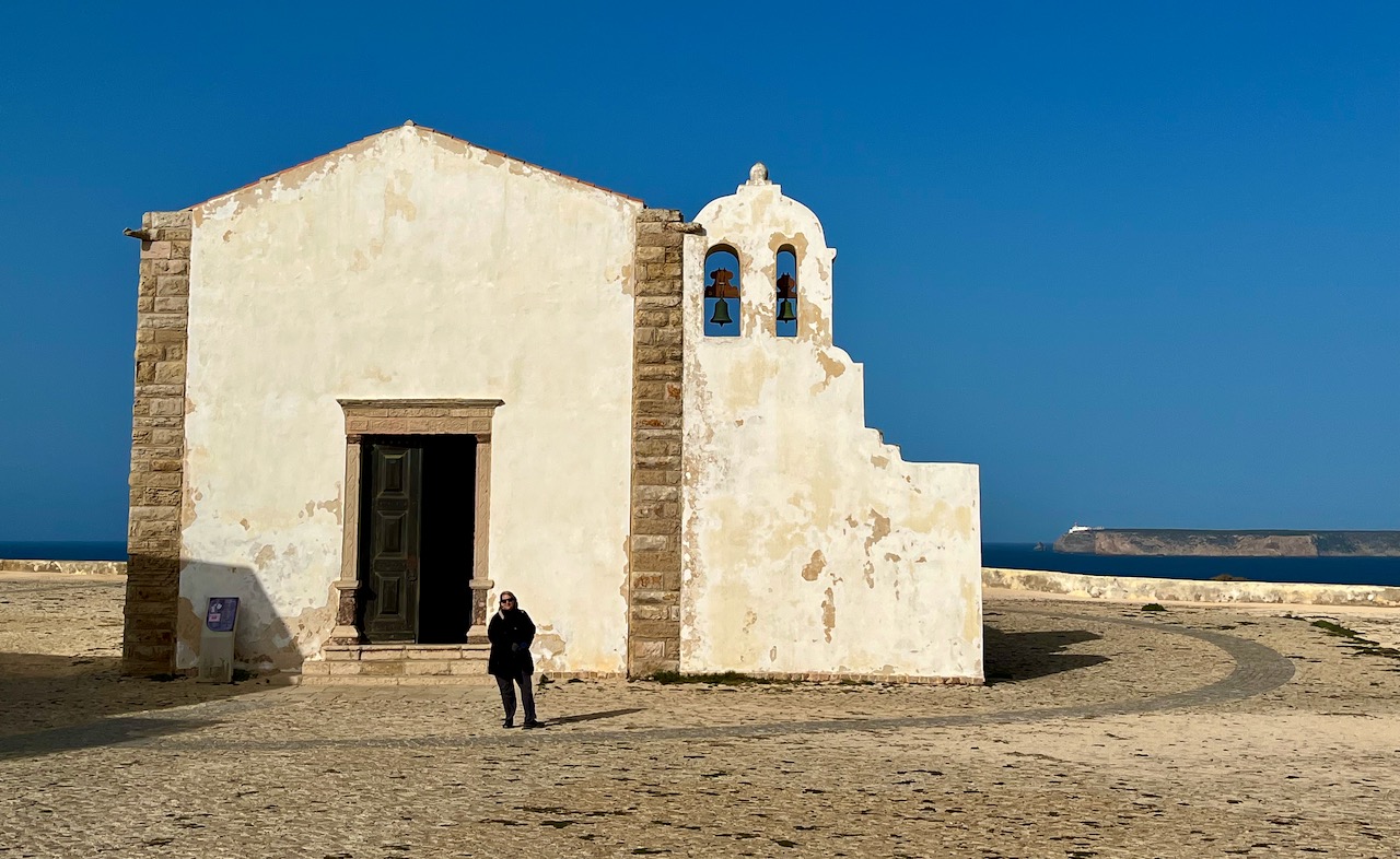 A few days ago Mary and I took a day-trip westward to the southwestern tip of Portugal, where the western and southern coasts meet. Here is Mary standing in front of an old chapel on Sagres Point, the Igreja de Nossa Senhora da Graça, built in 1570. This chapel is part of the compound that makes up the old Fortress of Sagres.