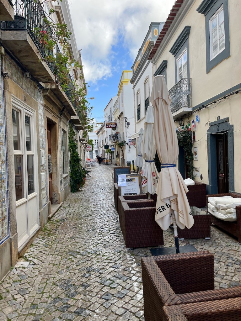 One of the narrow medieval streets of Tavira. Espresso and wine are available in every nook and cranny.