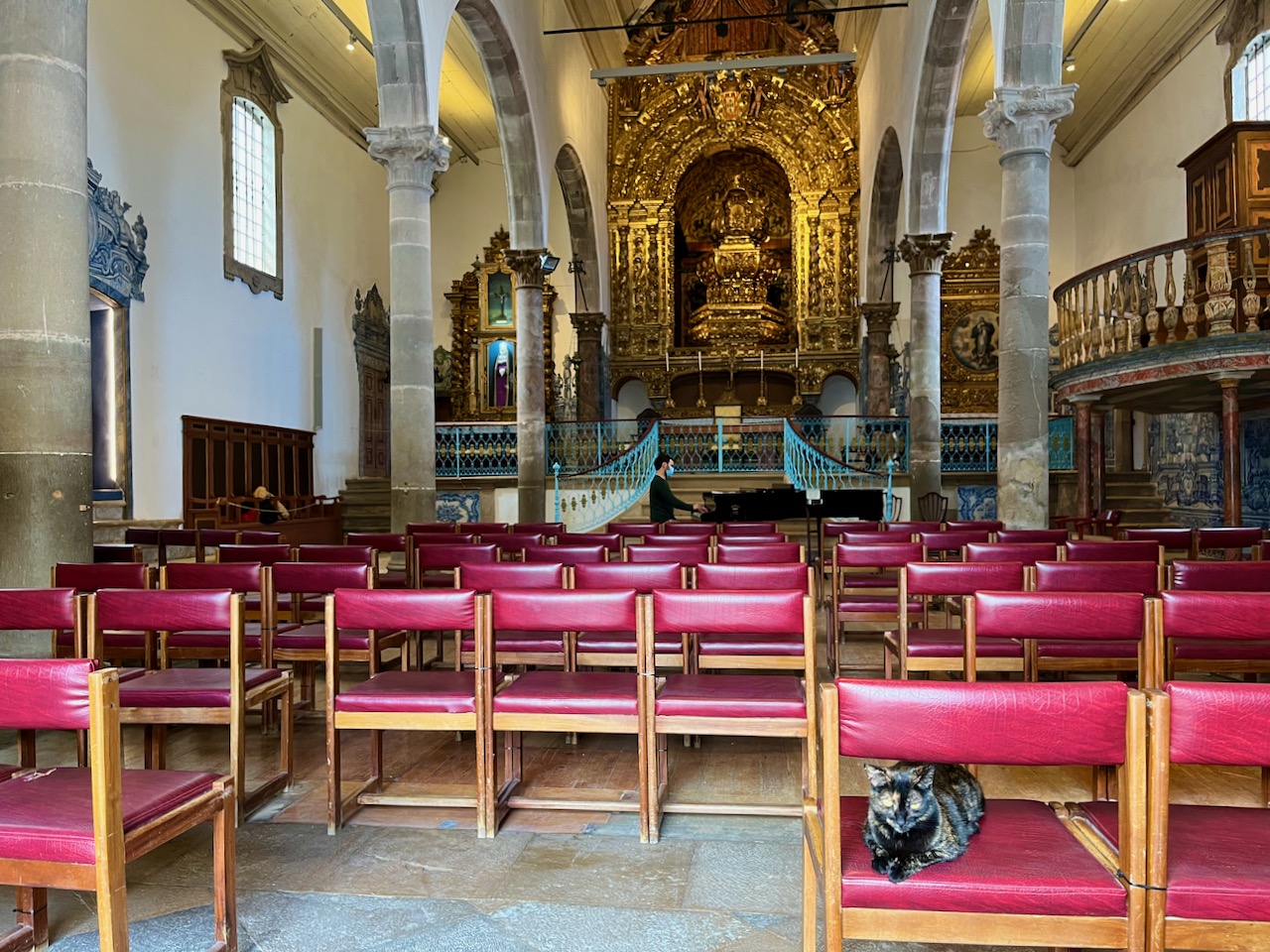 Mary and I were drawn to a medieval church because through its open doors we could hear piano music. I believe it was Chopin. Sure enough, in this ancient church a man was playing solo piano. And the entrance of the church was guarded by a…cat!