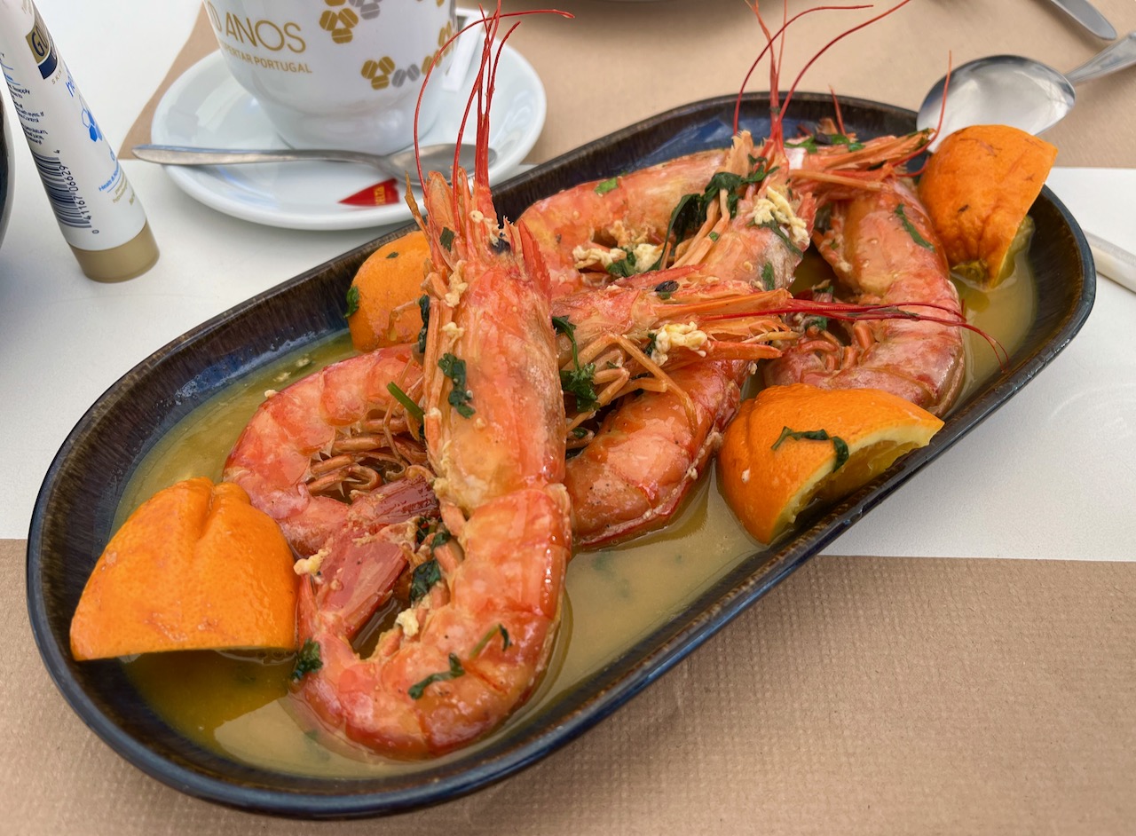 Before leaving Tavira, Mary and I enjoyed lunch on a riverside cafe. Though perhaps ‘enjoy’ is not the best word. This photo is an example of how food is prepared and served in Portugal, especially seafood. You get the entire product. The parts you can eat, the skeleton, tail, fins, head and eyes all end up on your plate. Each of these shrimps pictured Mary had to clean herself at the table as she ate.